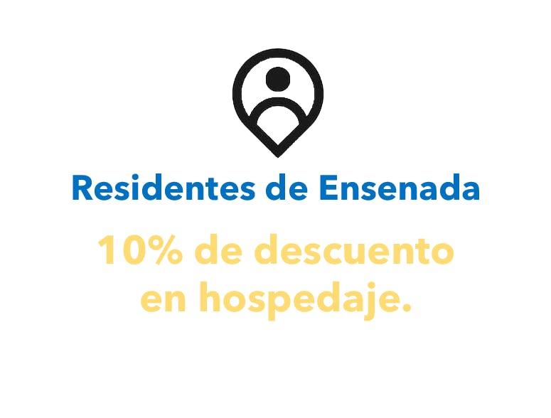 Reserva con nosotros y al momento de registrar tu llegada muestra una identificación oficial con domicilio de Ensenada para adquirir el descuento.